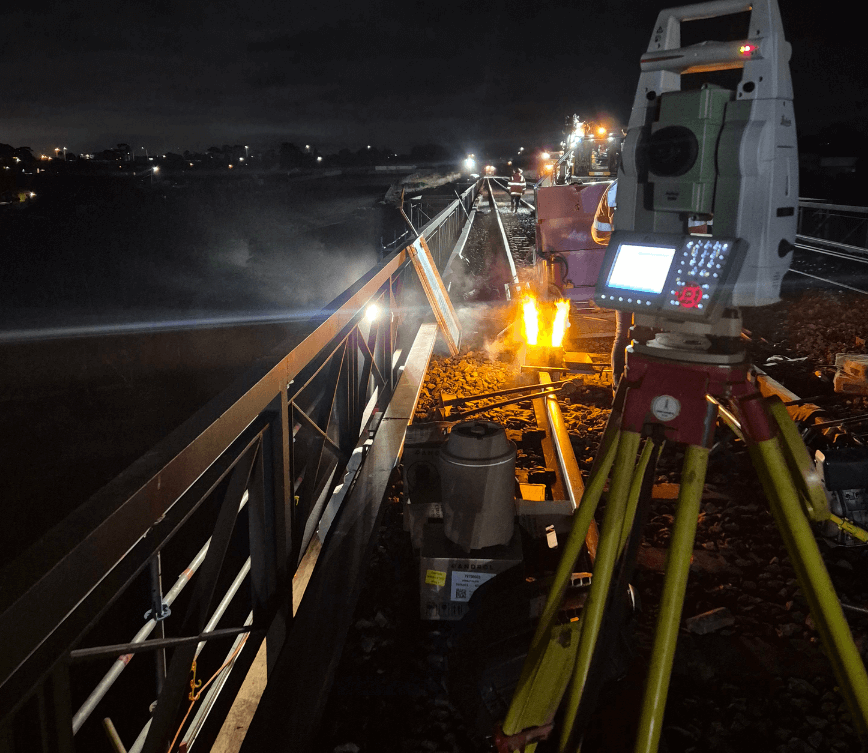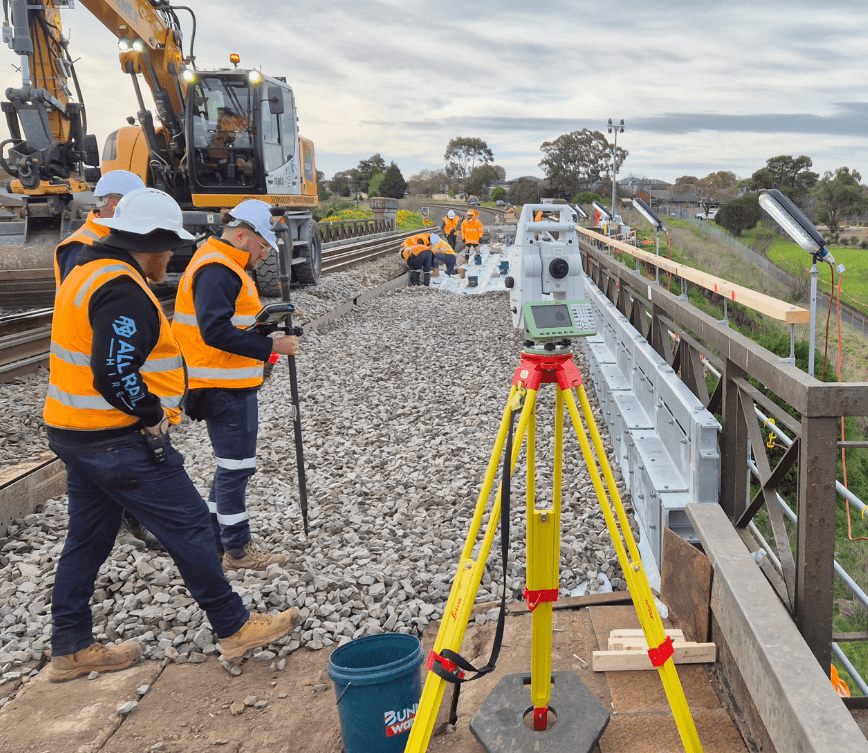 Base Surveys was engaged by Sterling Infrastructure to support a rail revival upgrade involving the refurbishment of an existing trestle bridge over the Moonee Ponds Creek viaduct. Our team worked across day and night shifts to facilitate the safe removal of existing platforms, installation of new platforms, ballast set-out, rail alignment set-out, and as-built verification of the final rail alignments.